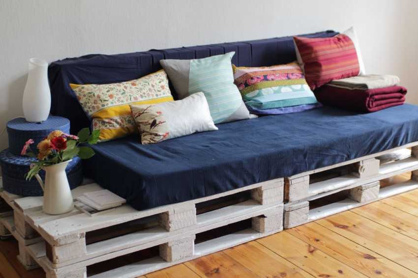 И здесь снова понадобится немного фантазии, чтобы придумать удобную конструкцию из имеющихся деталей. Поддоны можно разобрать на отдельные доски и использовать их, но это не обязательно. Достаточно собрать из них каркас дивана со спинкой и подлокотниками, скрепить все элементы вместе гвоздями или саморезами, а затем вырезать из поролона детали в соответствии с получившимися габаритами. Как и в предыдущем случае, их обтягивают тканью. А крепят на месте либо той же липучкой, либо резинками.