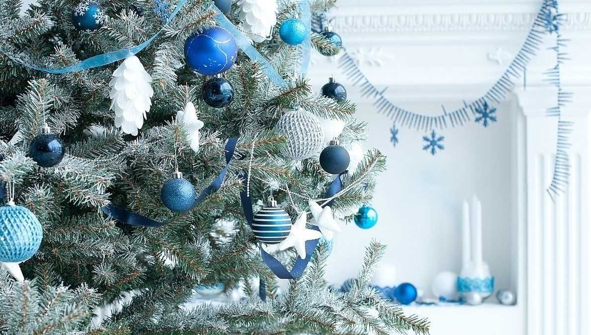 Белая елка, украшенная синим и серебряным, дышит Морозом.