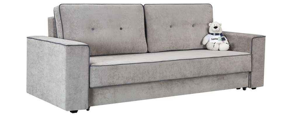 При первом взгляде на этот диван бросаются в глаза закругленные подлокотники, отделанные полимерными накладками. Размер спального места – 164*206 см, раскладывается в состояние кровати благодаря механизму “аккордеон”. Дополнительные вещевые ящики и полки для хранения не предусмотрены.