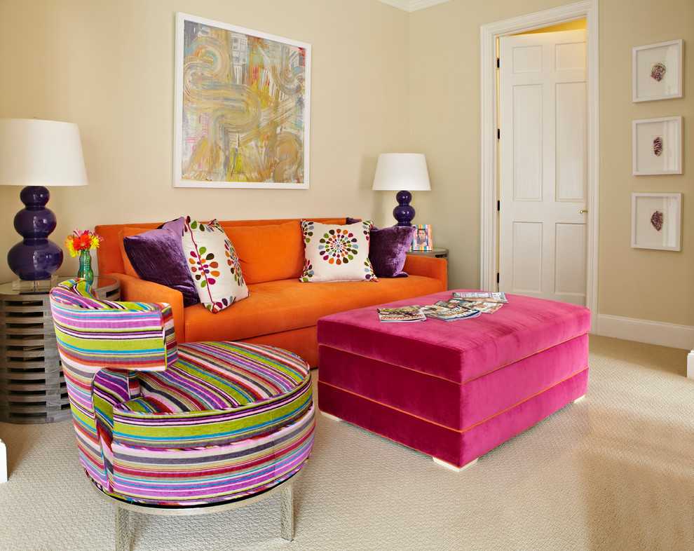 Диванчик цвета фуксии с разноцветными полосами на сиденье