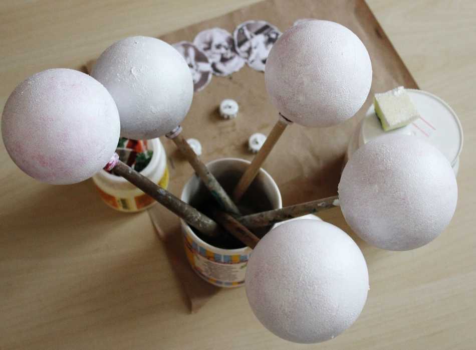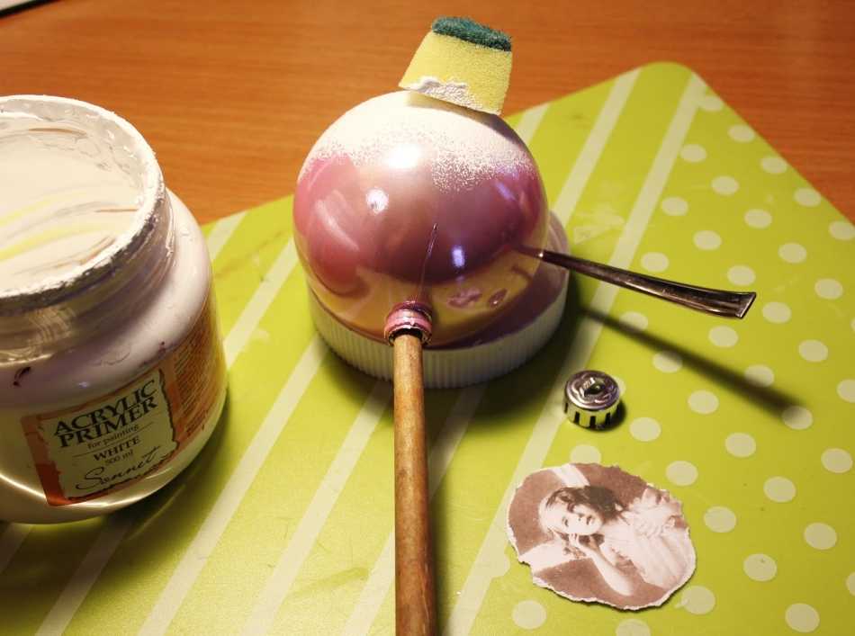 Первым делом, шарик проходит подготовку – грунтуется с помощью губки. Для удобства рекомендуется предварительно снять крышечки с шаров и насадить шарики на палку. Кстати, крышечки тоже стоит обработать грунтовкой.