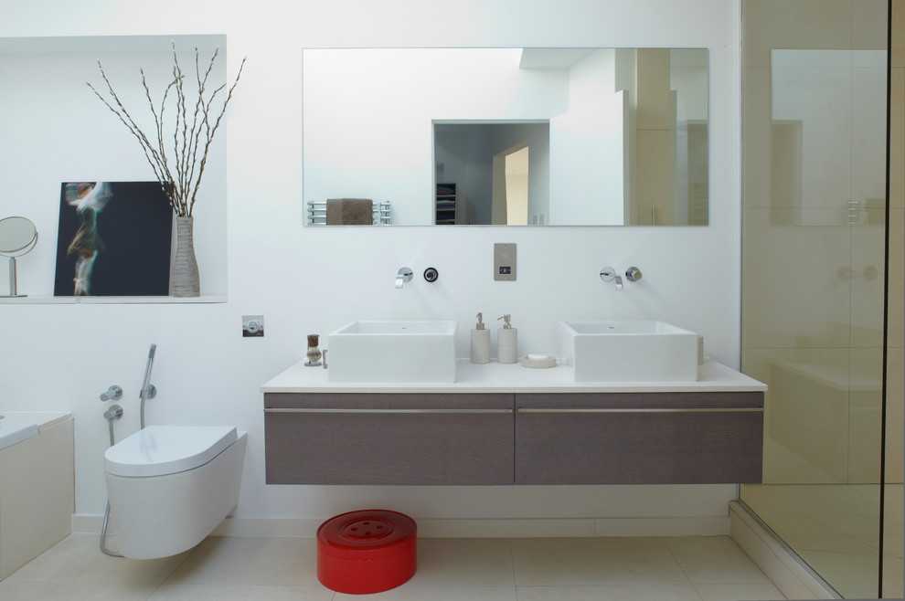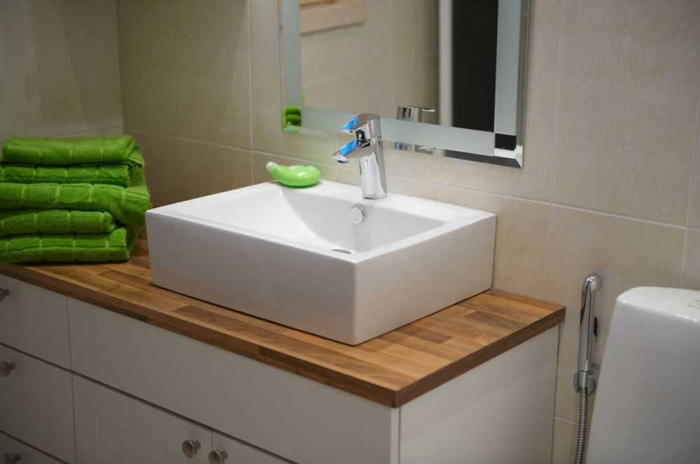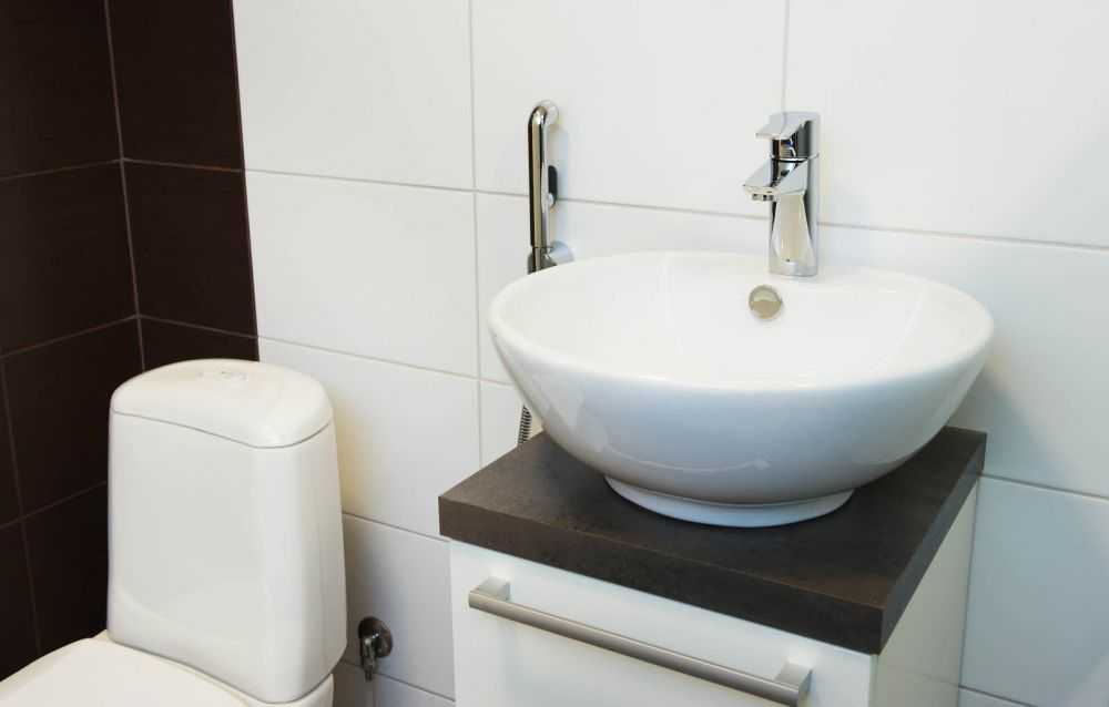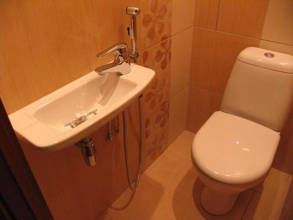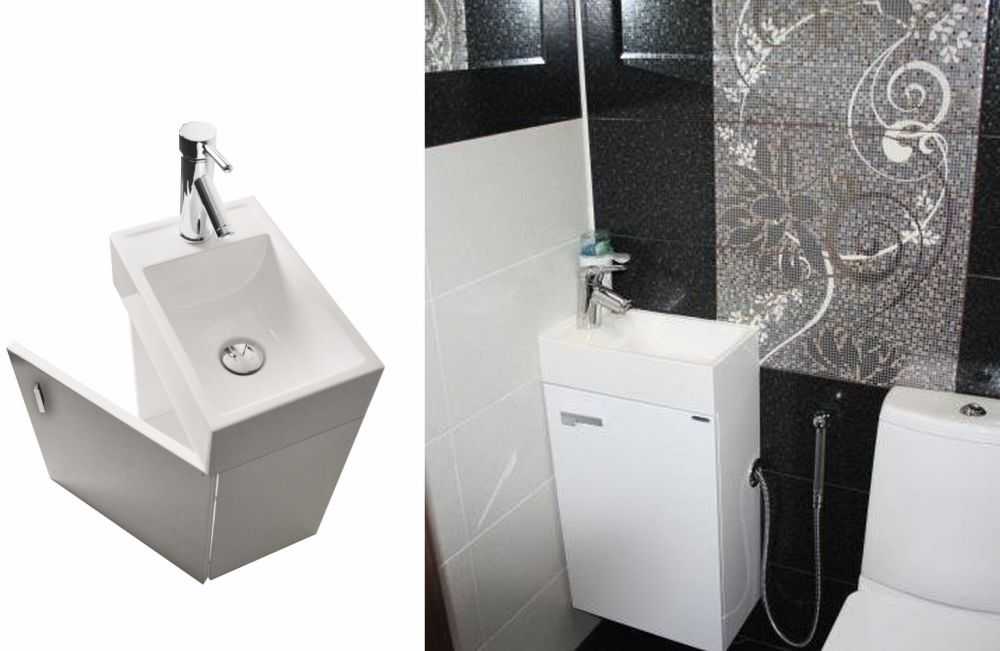 В некоторых случаях маленький санузел оборудуется небольшим рукомойником, шириной не более 45 см. Удобнее всего будет угловая раковина, установленная над унитазом. Такая хитрость позволит не только установить смеситель с системой мини-биде, но и даст возможность осуществлять другие гигиенические процедуры.
