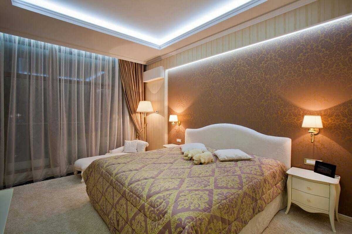 На потолке спальни, применив светодиоды, можно изобразить «звездное небо», выложить гибким шнуром очертание созвездий или знаки Зодиака… В любом случае деликатное освещение в спальной может стать весьма удачным решением.