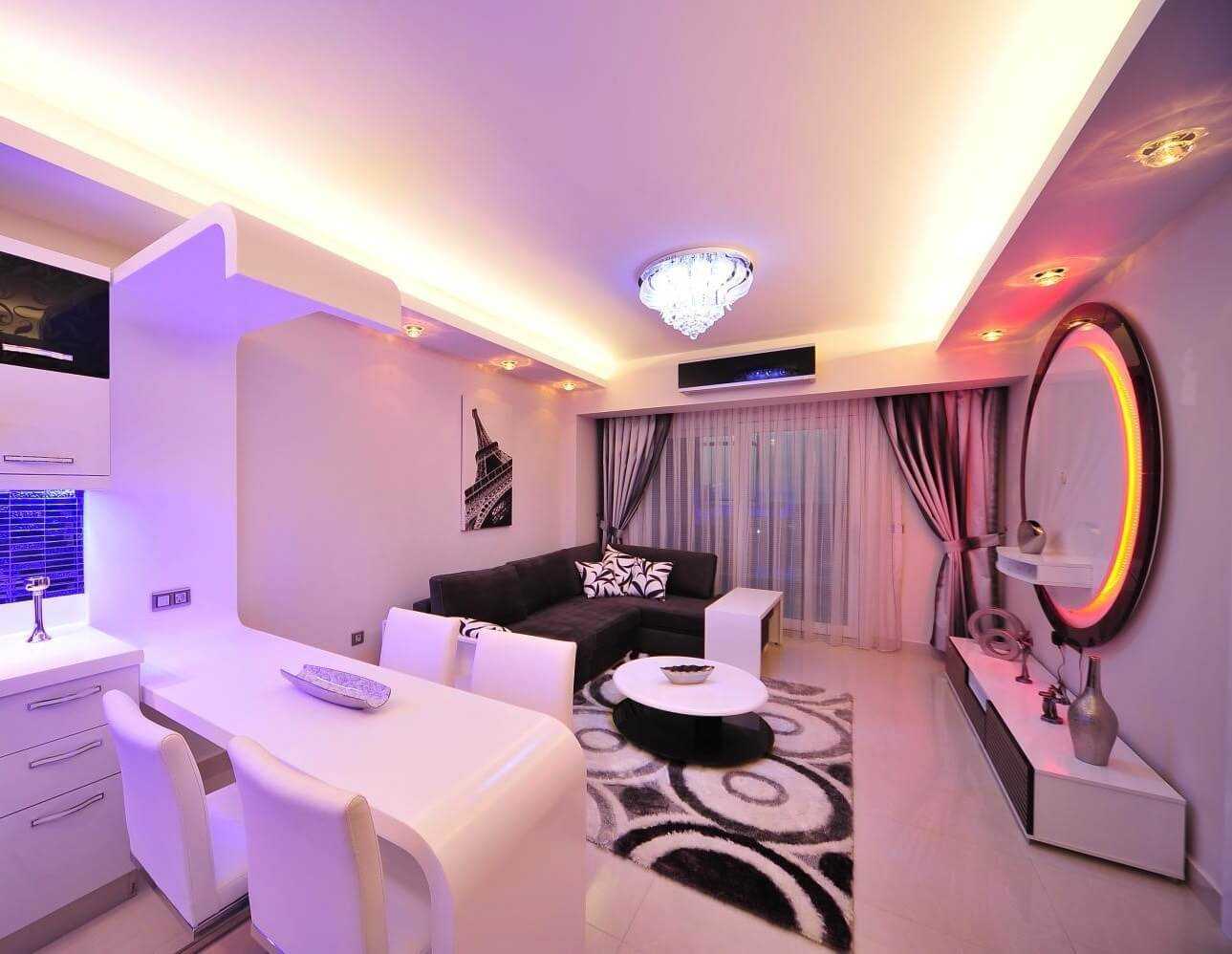 При неоновом — обстановка слишком яркая, не расслабляет организм человека. Используется для ночного клуба или второй гостиной. Диодная лента создает комфортную и расслабляющую атмосферу, за счет того, что ленту при монтаже прячут во второй уровень каркасного потолка. Теплые лучи с помощью ламп влияют на человека успокаивающе, в комнате ощущается комфорт, нет напряженное обстановки.