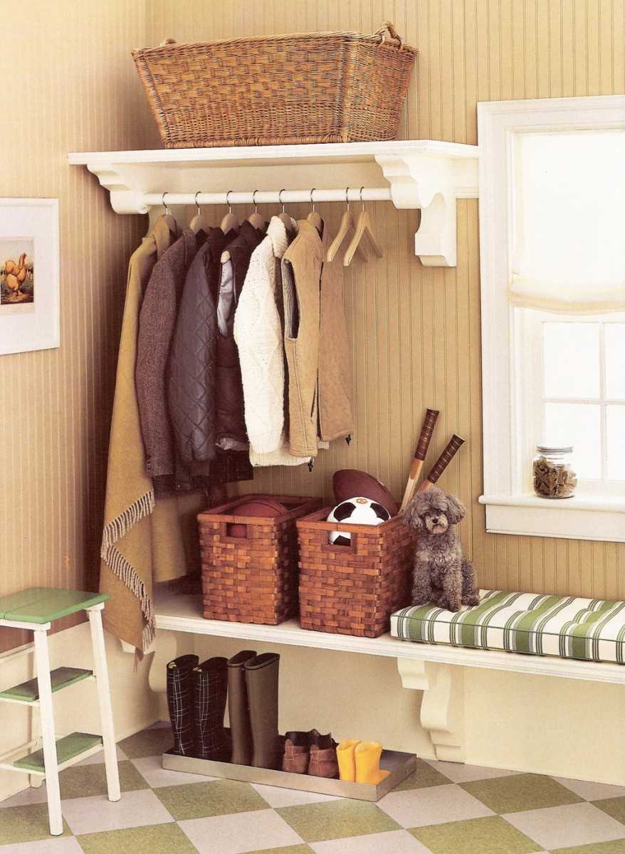 Из-за малого объема коридора стоит увеличить функциональность скамейки, выбрав модель с полкой или шкафом.