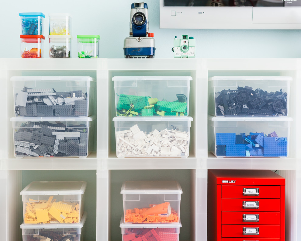 Для детской комнаты стоит выбрать пластиковые ящики. Такие контейнеры бывают ярких цветов, что подчеркивает непринужденный стиль помещения.