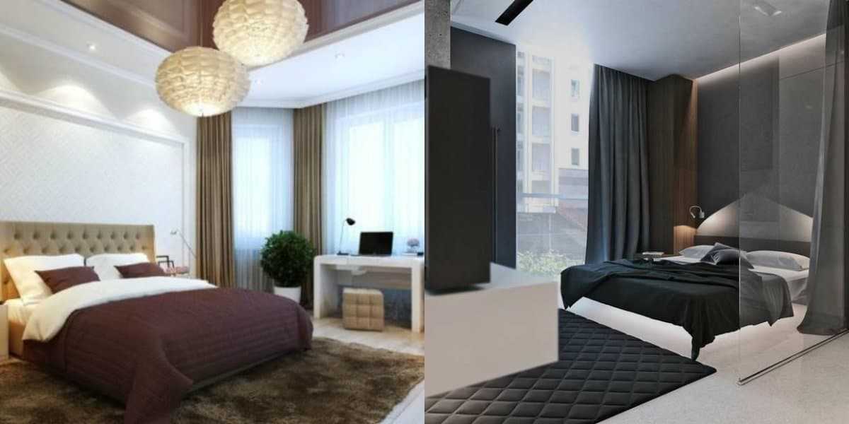 Монохромный. Одной из особенностей становится размещение элементов темной палитры, совпадающих по тону с гардиной.