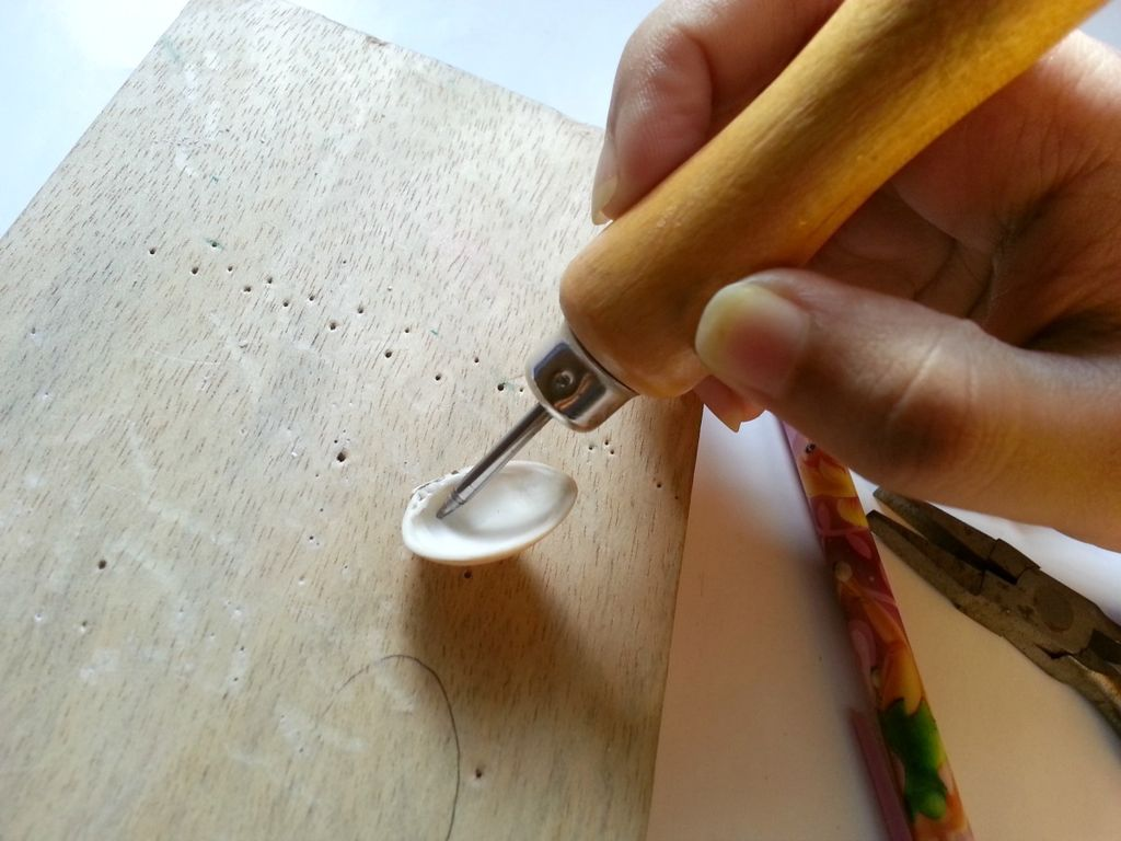 Дрелью или шуруповертом – кладем ракушку на деревянную доску и приклеиваем скотчем. Берем самое тонкое сверло и делаем дырочку прямо поверх скотча, это не позволит материалу раскрошиться.