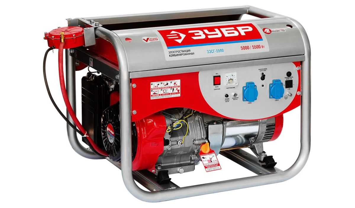 Газово-бензиновый генератор российского производства ЗУБР ЗЭСГ-5500 оснащен двигателем на 389 см3, предназначенным для работы от двух видов топлива. Бензиновый бак рассчитан на 25 л АИ-92, которого хватает на 9 часов автономного электроснабжения (мощность 5-5.5 кВт). Кроме двух выходов на 22 В модель имеет дополнительную розетку 12 В. Устройство отличается надежной защитой от сетевых перегрузок.