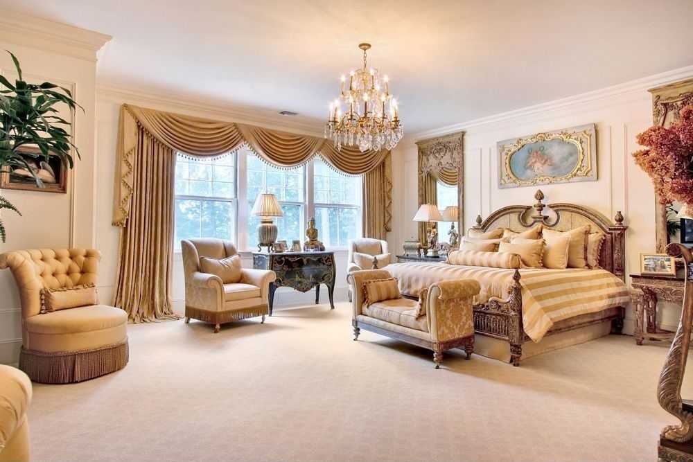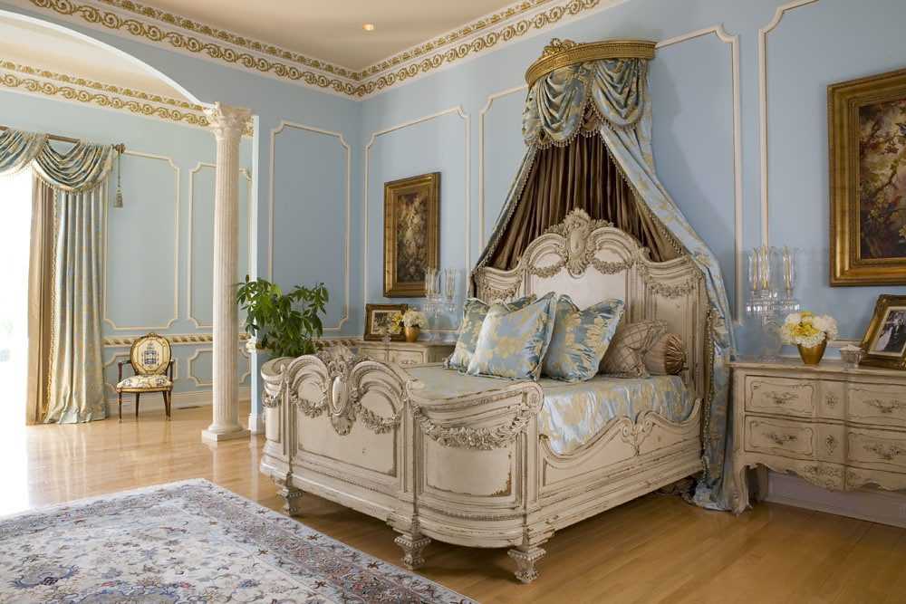 Аристократические мотивы в интерьере спальни представлены в виде великолепной мебели и отделочных материалов