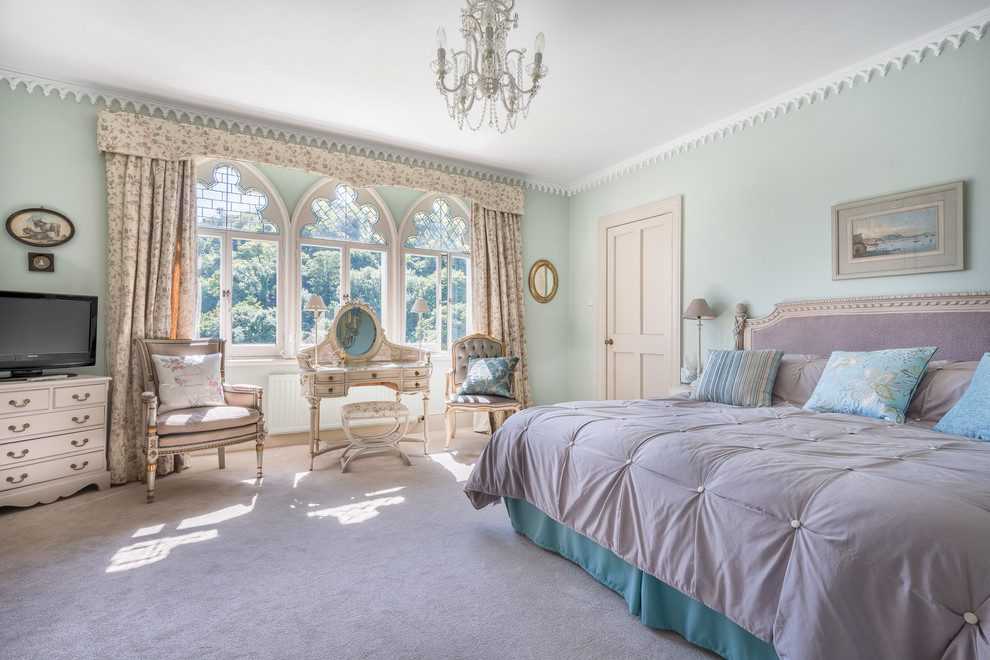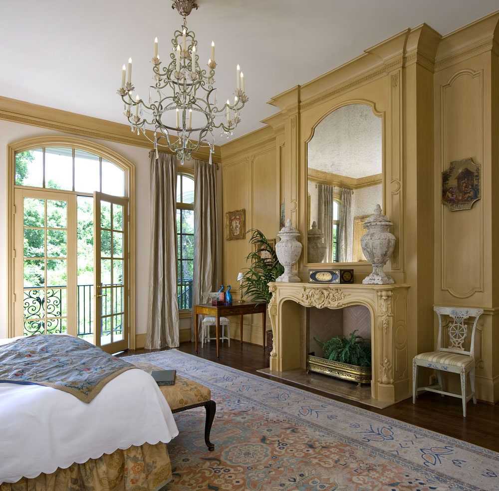 Пастельные тона комнаты располагают к спокойствию и отдыху, а декоративный белый камин подчеркивает классический стиль спальни