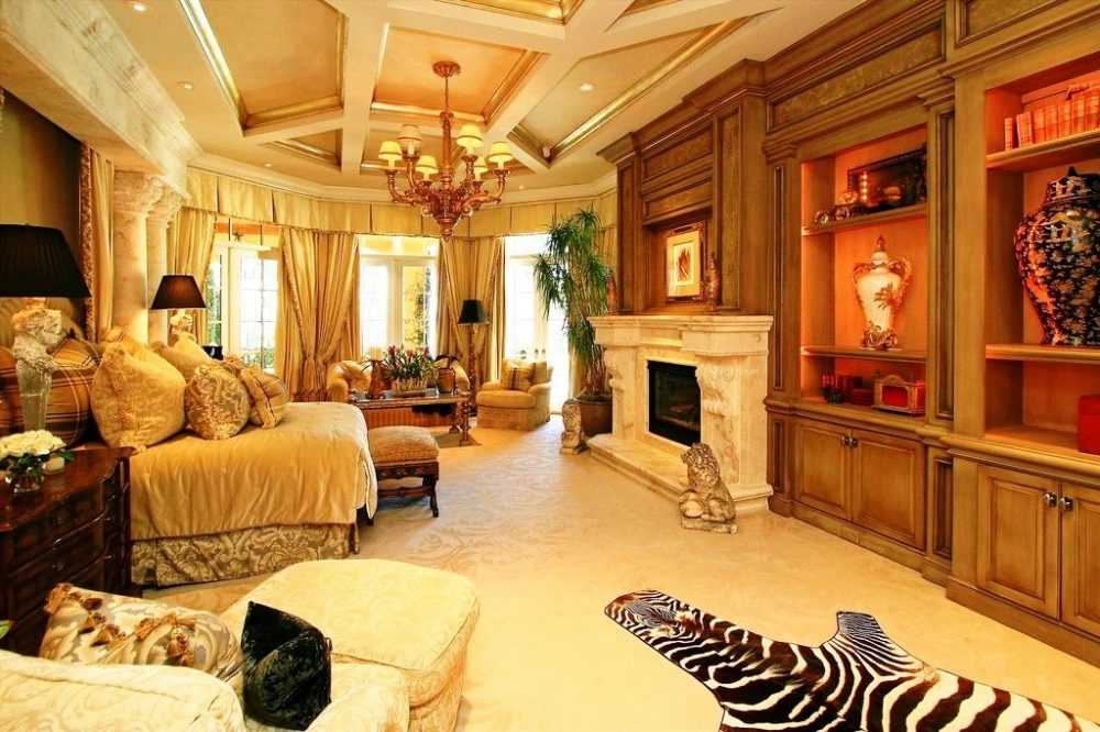 Большая, роскошная кровать с декоративным изголовьем, использование ценных ковров и качественных тканей, декоративная отделка стен, все эти элементы спальни скомпонованы в единую композицию
