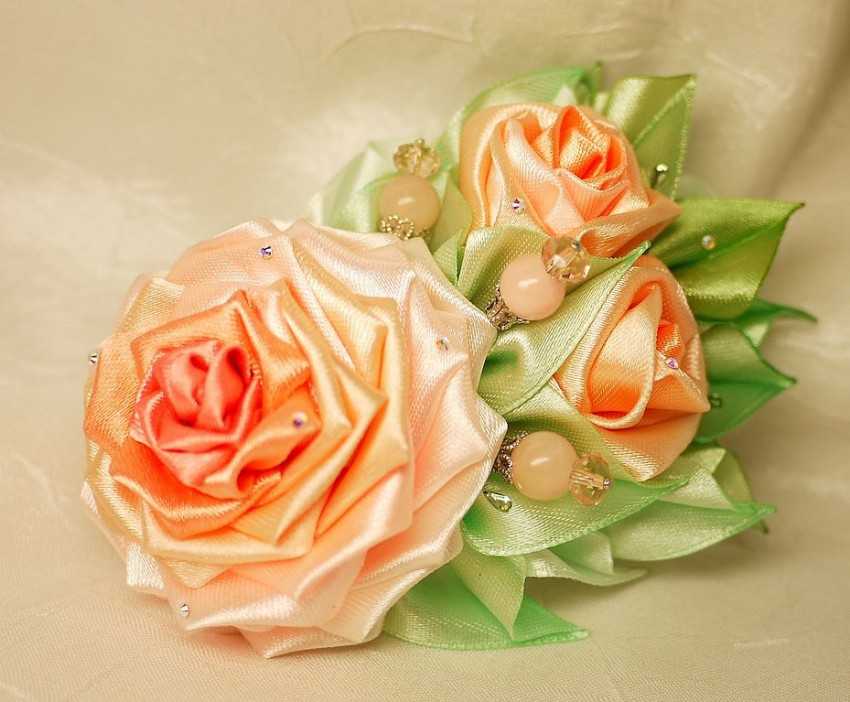 Розы из атласных лент своими руками начинают создавать с бутонов. На готовый бутон наматывается широкая полоса атласа. Для получения цветка большего объёма, лепестки делаются крупнее. Законченная роза сшивается у основания.