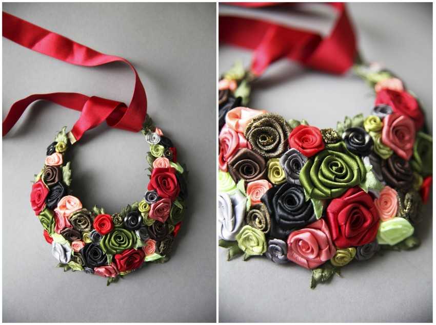 - Розы выполняются из лент в различных техниках. Самая простая – взять длинный кусочек ленты и прошить его ниткой, после чего сформировать сборку, потянув за один конец нити. Из собранной ленты легко можно сформировать розочку. Для закрепления используем клей;