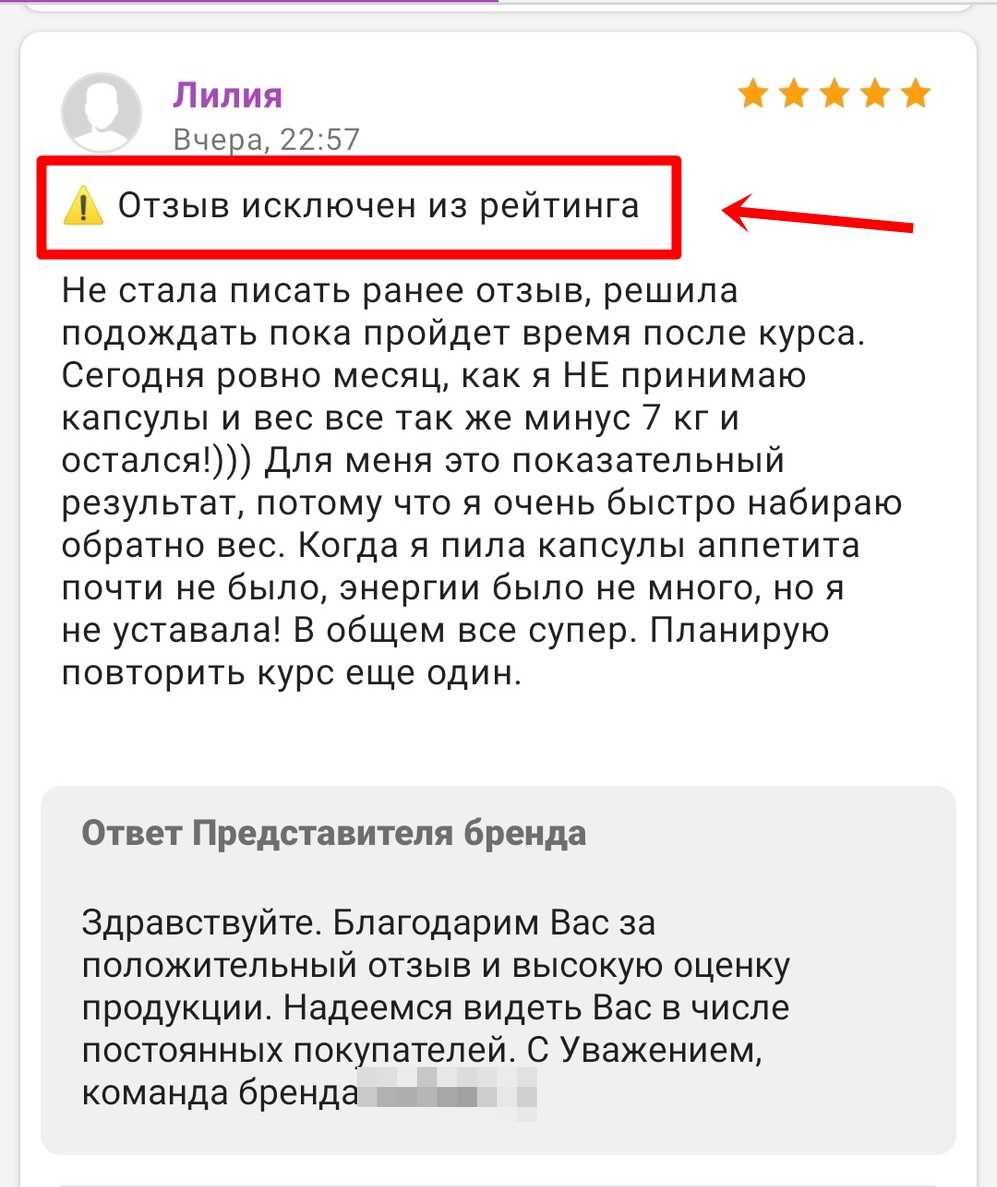 Фактически появление отметки «Отзыв исключен из рейтинга» на Вайлдберриз значит, что площадка воспользовалась своим правом и отнесла его к категории неактуальных. Он больше не используется при определении места продукта в поисковой выдаче и в принципе может быть удалено в любое время.