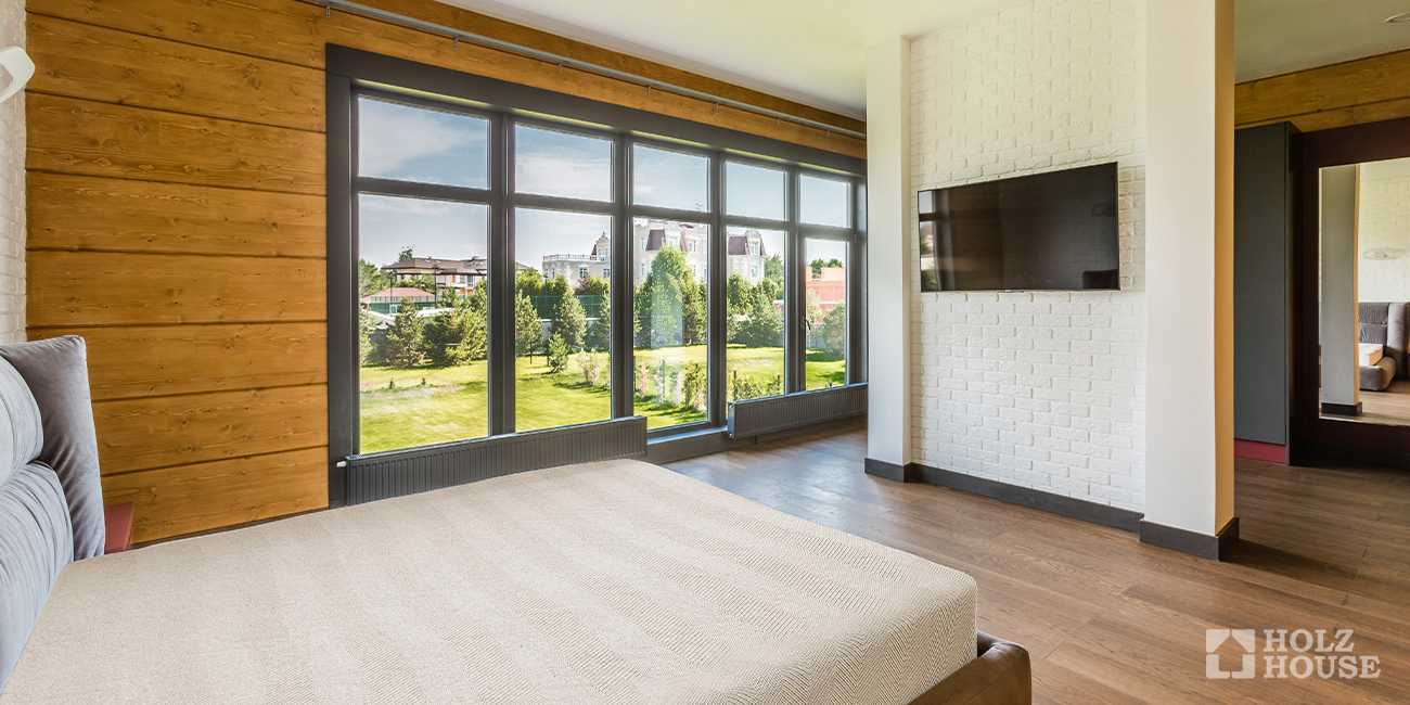 Увеличенная длина заготовок – от 6 до 18 метров – значительно расширяет допустимые границы применения пиломатериала. Появляется шанс реализовать нестандартные проекты домов из клееного бруса, изобилующие функциональными и декоративными дополнениями. С его помощью можно создавать гнутые и сложные конфигурации, длинные стены без необходимости в сращивании и обустройстве перестенков. Сборка осуществляется без привязки ко времени года и погоде.