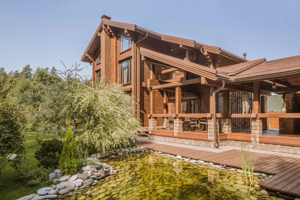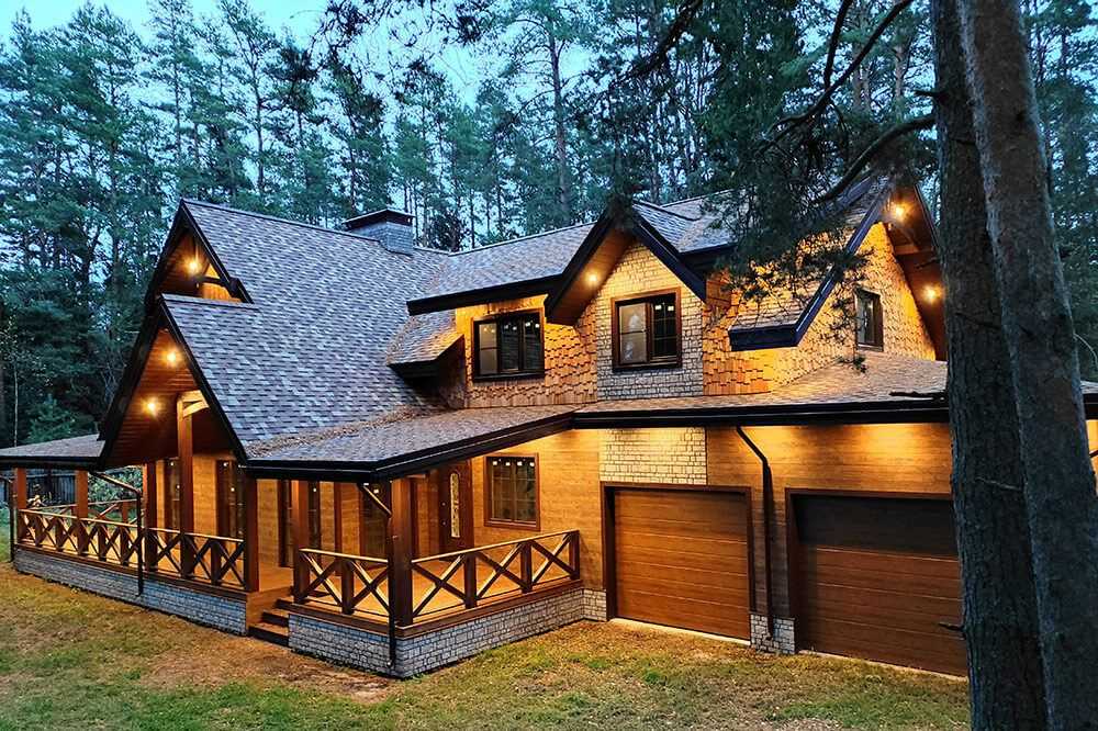 ΠΠ°ΡΠΊΠ°ΡΠ½ΡΠΉ Π΄ΠΎΠΌ ΡΠΎ ΡΠ»ΠΎΠΆΠ½ΠΎΠΉ ΠΌΠ½ΠΎΠ³ΠΎΡΡΠΎΠ²Π½Π΅Π²ΠΎΠΉ ΠΊΡΠΎΠ²Π»Π΅ΠΉ, Π³ΠΎΡΡΠΈΠ½ΠΎΠΉ ΡΠΎ Π²ΡΠΎΡΡΠΌ ΡΠ²Π΅ΡΠΎΠΌ, Π΄Π΅ΡΠ΅Π²ΡΠ½Π½ΠΎΠΉ ΠΊΠΎΠΌΠ±ΠΈΠ½ΠΈΡΠΎΠ²Π°Π½Π½ΠΎΠΉ ΠΎΡΠ΄Π΅Π»ΠΊΠΎΠΉ, Π±ΠΎΠ»ΡΡΠΎΠΉ ΡΠ΅ΡΡΠ°ΡΠΎΠΉ ΠΏΠΎΡΡΡΠΎΠ΅Π½ Π² ΡΡΠΈΠ»Π΅ Π°ΠΌΠ΅ΡΠΈΠΊΠ°Π½ΡΠΊΠΎΠ³ΠΎ Π΄Π΅ΡΠ΅Π²Π΅Π½ΡΠΊΠΎΠ³ΠΎ Π΄ΠΎΠΌΠΈΠΊΠ°, ΠΈΠ»ΠΈ Β«Π»Π΅ΡΠ½ΠΎΠΉ Π±Π΅ΡΠ»ΠΎΠ³ΠΈΒ». ΠΠ³ΠΎ ΠΏΠ»ΠΎΡΠ°Π΄Ρ 522ΠΊΠ².ΠΌ, ΠΈ ΠΎΠ½ Π²ΠΌΠ΅ΡΠ°Π΅Ρ 5 ΡΠΏΠ°Π»Π΅Π½, 3 ΡΠ°Π½ΡΠ·Π»Π°, Π³ΠΎΡΡΠΈΠ½ΡΡ, ΠΊΡΡ Π½Ρ-ΡΡΠΎΠ»ΠΎΠ²ΡΡ, Π±ΠΈΠ»ΡΡΡΠ΄Π½ΡΡ ΠΈ Π³Π°ΡΠ°ΠΆ Ρ Π²ΡΡ ΠΎΠ΄Π°ΠΌΠΈ Π² ΠΏΡΠ°ΡΠ΅ΡΠ½ΡΡ ΠΈ ΠΊΠΎΡΠ΅Π»ΡΠ½ΡΡ. ΠΠ· ΠΊΡΡ Π½ΠΈ-Π³ΠΎΡΡΠΈΠ½ΠΎΠΉ ΠΏΠΎΠΏΠ°Π΄Π°Π΅ΡΡ Π½Π° Π·Π°Π΄Π½ΠΈΠΉ Π΄Π²ΠΎΡ Ρ Π²ΡΡΠΎΠΊΠΈΠΌΠΈ ΡΠΎΡΠ½Π°ΠΌΠΈ. ΠΠΎ Π²Π½Π΅ΡΠ½Π΅ΠΉ ΠΎΡΠ΄Π΅Π»ΠΊΠ΅ Π΄ΠΎΠΌΠ° ΠΏΡΠΈΠΌΠ΅Π½Π΅Π½Ρ Π½Π°ΡΡΡΠ°Π»ΡΠ½Π°Ρ ΠΊΠ΅Π΄ΡΠΎΠ²Π°Ρ Π΄ΡΠ°Π½ΠΊΠ°, Π±ΡΠ°ΡΠΈΡΠΎΠ²Π°Π½Π½Π°Ρ (ΡΠΎΡΡΠ°ΡΠ΅Π½Π½Π°Ρ) ΠΈΠΌΠΈΡΠ°ΡΠΈΡ Π±ΡΡΡΠ°, Π»ΠΈΡΡΠ²Π΅Π½Π½ΠΈΡΠ°, Π° ΡΠ°ΠΊΠΆΠ΅ ΡΠ΅ΡΠΌΠΎΠΏΠ°Π½Π΅Π»ΠΈ Ρ ΠΏΠ»ΠΈΡΠΊΠΎΠΉ ΠΈΠ· ΠΈΡΠΊΡΡΡΡΠ²Π΅Π½Π½ΠΎΠ³ΠΎ ΠΊΠ°ΠΌΠ½Ρ, ΠΈΠΌΠΈΡΠΈΡΡΡΡΠ΅Π³ΠΎ ΡΠ°Π·Π½ΠΎΡΠΎΡΠΌΠ°ΡΠ½ΡΠΉ ΡΠ΅Ρ.