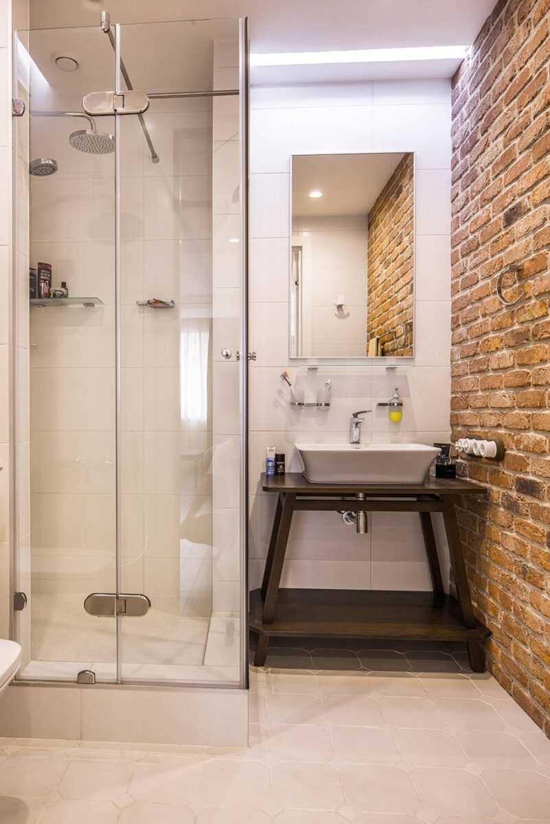 - Использование кирпича. Неплохо сочетается с плиткой или деревом и стеклом кирпичная кладка, причем это может быть и натуральный кирпич, и его имитация.