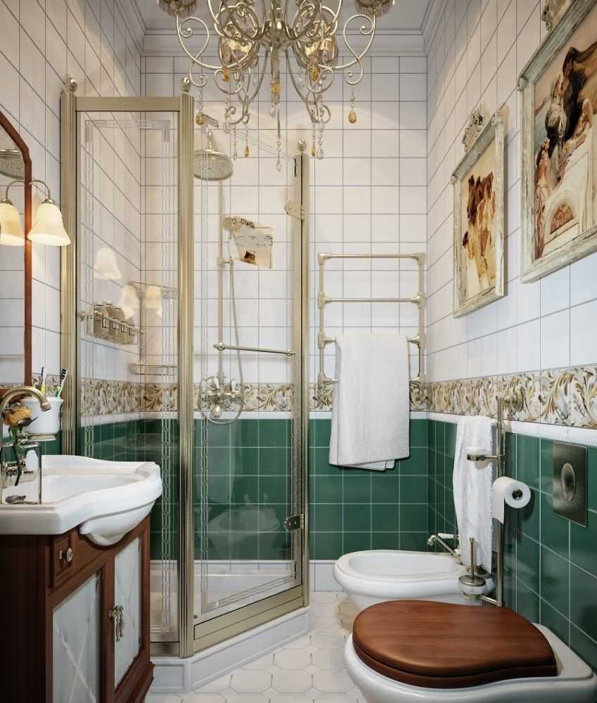 - Классика. Как правило, используются светлые тона, гармонирующие с привычной белой ванной и раковиной. Придают изящный вид светильники с хрустальными элементами, тяжелые винтажные рамы зеркал.
