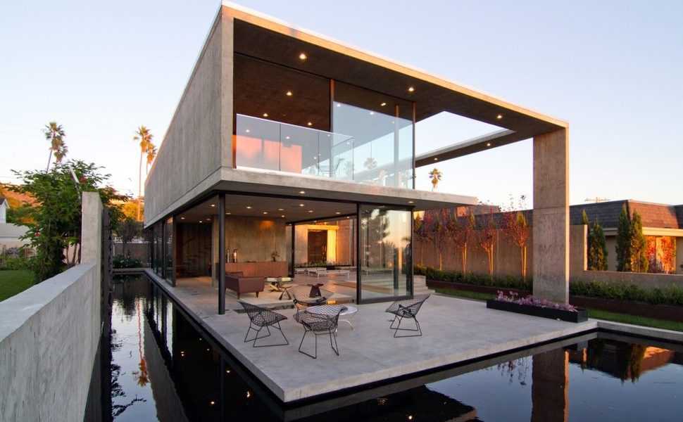 Главная особенность дома – стеклянные стены, однако они нисколько не нарушают уединение его обитателей, благодаря ограде из бетона, которая аккуратно огибает дом. Плоская бетонная крыша прикрывает половину дома и с избытком обеспечивает жилое пространство естественным освещением.