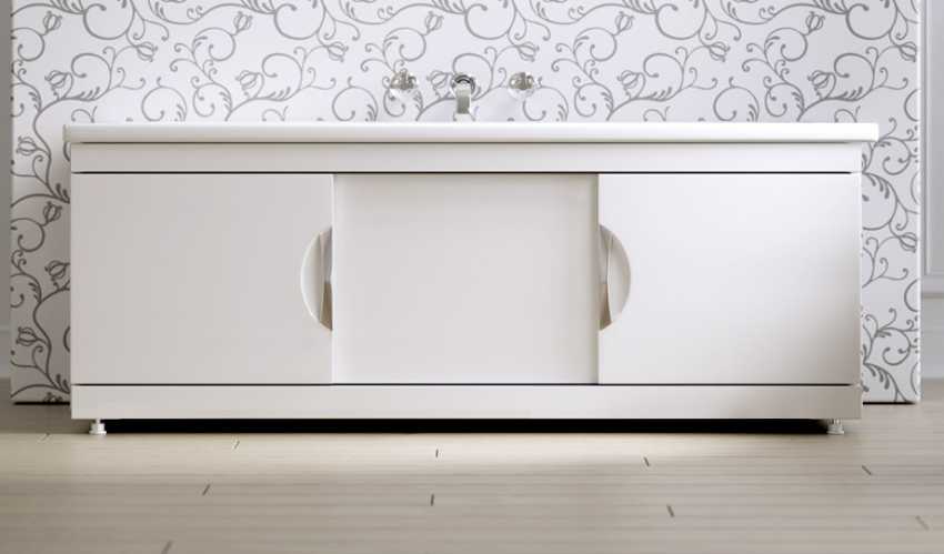 глухой стеной — данный тип экрана собой закрывает полностью все пространство под ванной, не предполагая никаких выемок для удобства или ниш для вещей. При его установке следует тщательно перепроверить исправность всей сантехники и труб, так как потом это будет сделать проблематично. Обычно, такие типы экранов предполагают наличие небольшой дверцы для проверки состояния сантехники.