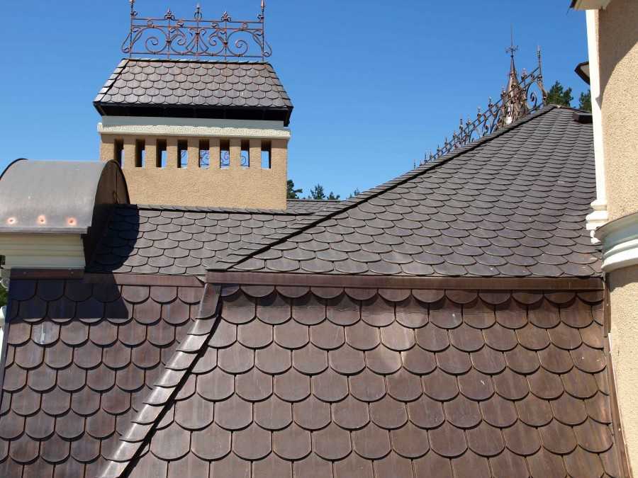 Это фактически единственно приемлемый вариант для кровли, имеющей множество изогнутых поверхностей. Кроме того, такое покрытие экономично, она практически не дает отходов.