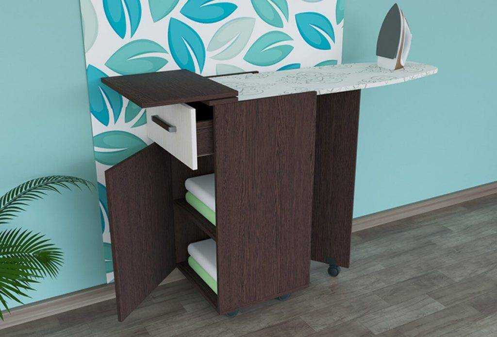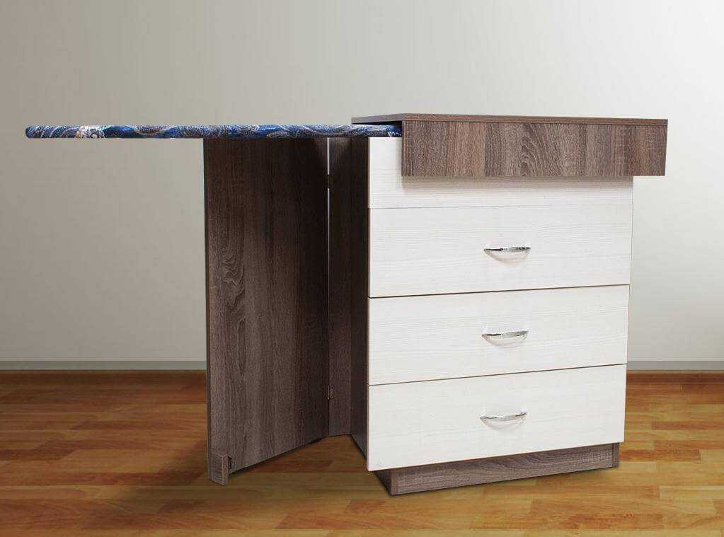 Для спальни, ванной или лоджии можно заказать мини-комод, столешницей которого будет гладильная доска. Внизу размещаются отсеки, куда можно складывать неглаженные или поглаженные вещи, утюг, аксессуары к нему, швейные принадлежности и многое другое. Выглядит такая конструкция очень симпатично и совершенно не портит интерьер.