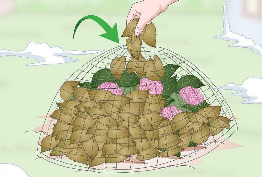 - наземную часть кустов (побеги) обмотать воздухопроницаемым укрывным материалом, вокруг установить каркас из мелкой металлической сетки, свободное пространство заполнить сухими листьями, сверху накрыть плёнкой или куском рубероида.