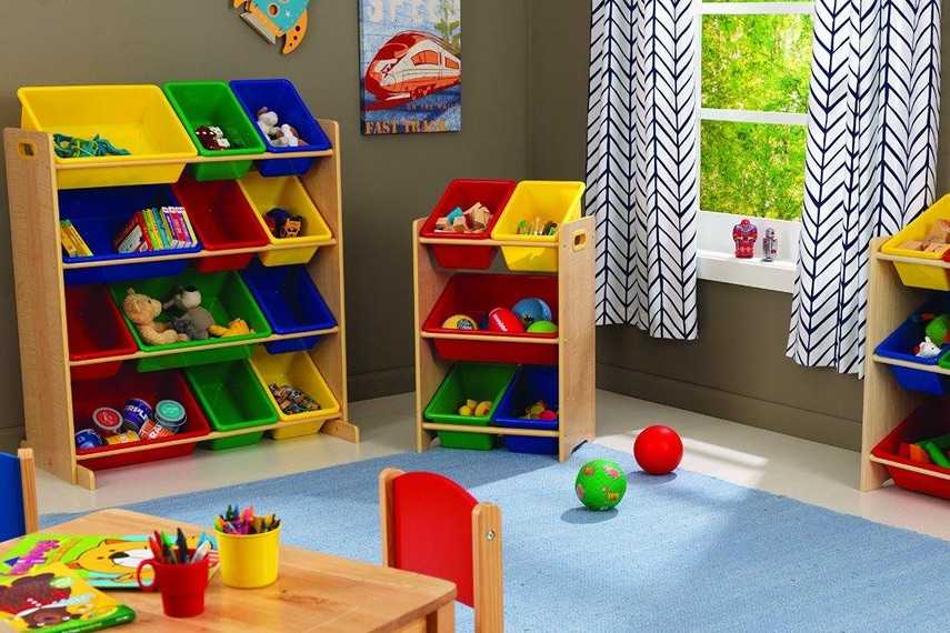 - Детский стеллаж для игрушек и коробки для хранения оптимально размещать рядом с игровой зоной.