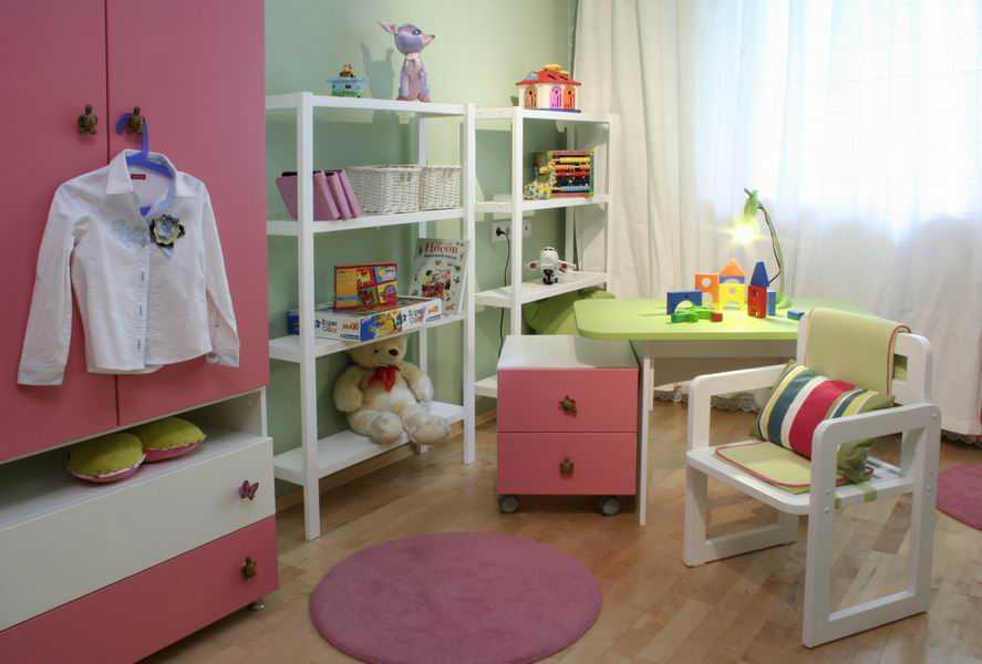 - Если в комнате есть стеллажи, то расставлять детские вещи на них лучше в таком порядке: