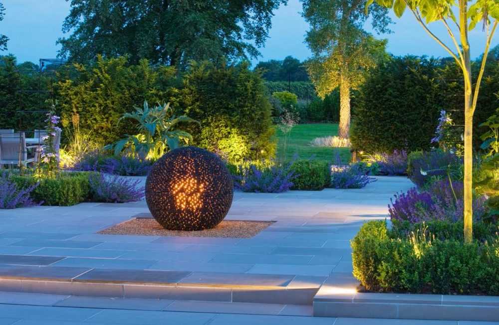 Интересная многоярусная конструкция в саду, оснащенная точечным освещением и подсветкой ступенек