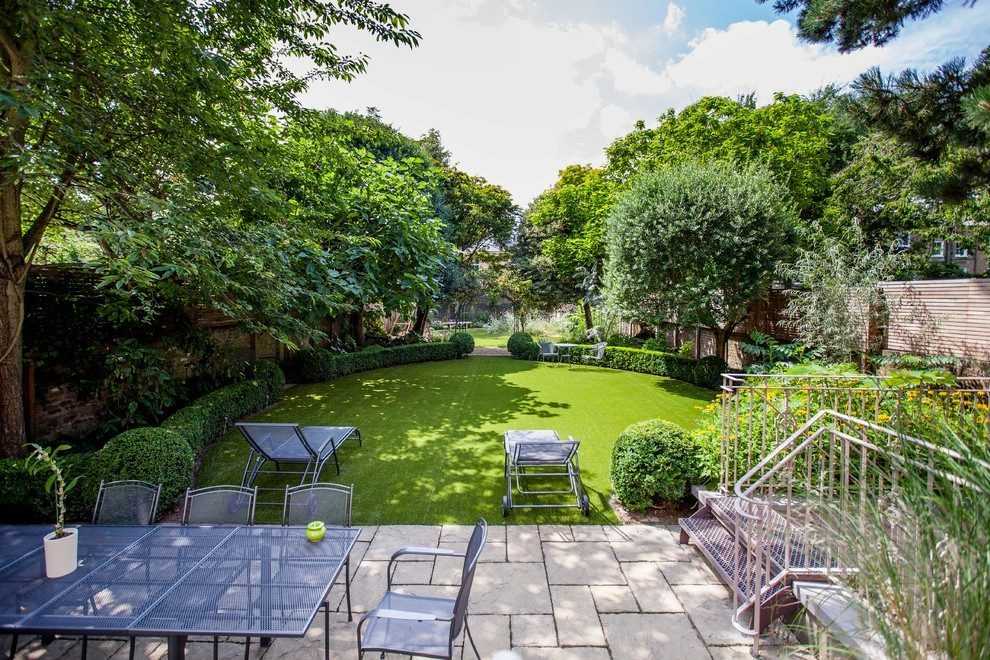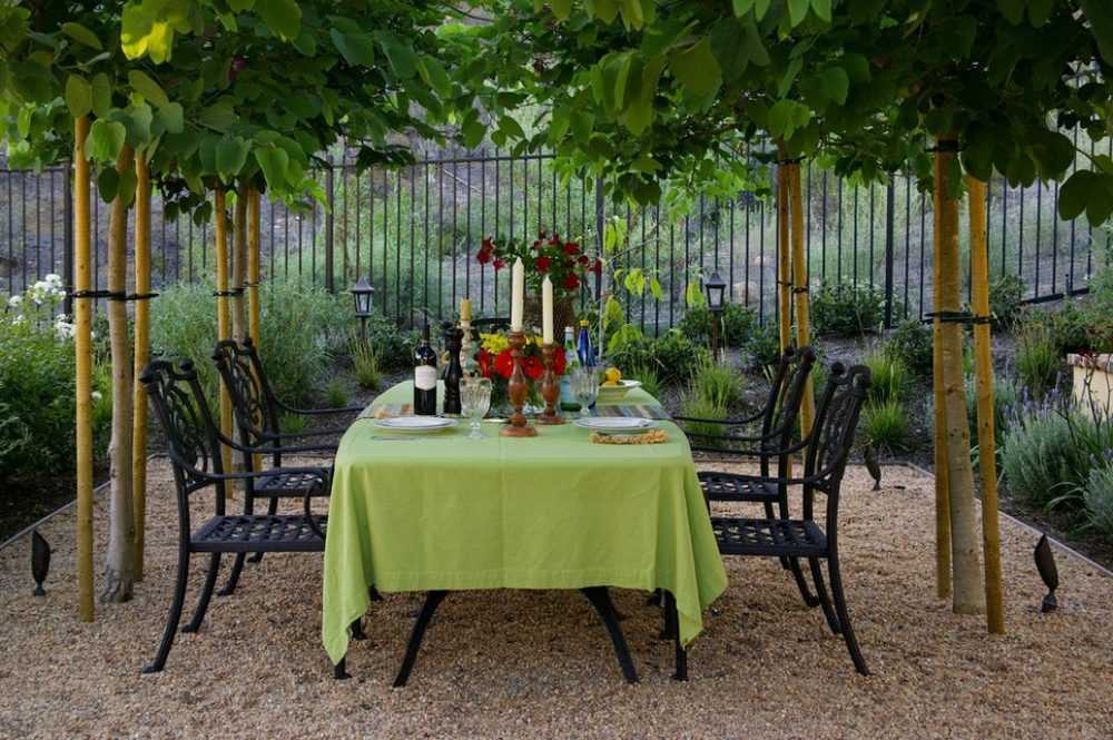 Уютное место для посиделок в небольшом саду, обилие зелени обеспечивает спокойное хорошее настроение