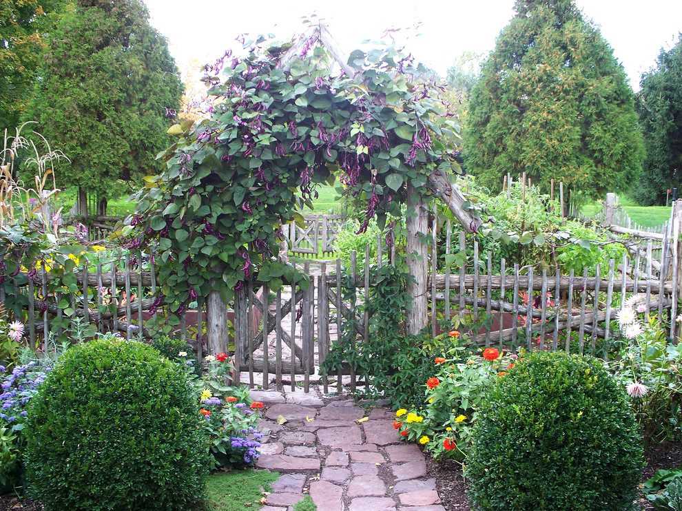 В садах классического стиля дорожку можно обрамить стриженым бордюром, чаще всего их делают из самшита. Можно использовать любые низкорослые растения с плотной фактурой, главное — регулярно подстригать и сохранять их компактную форму, чтобы посадки выглядели как бордюр.