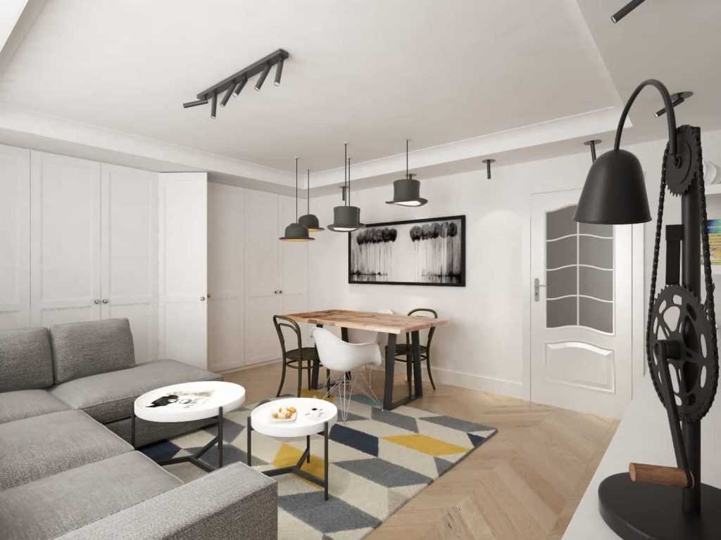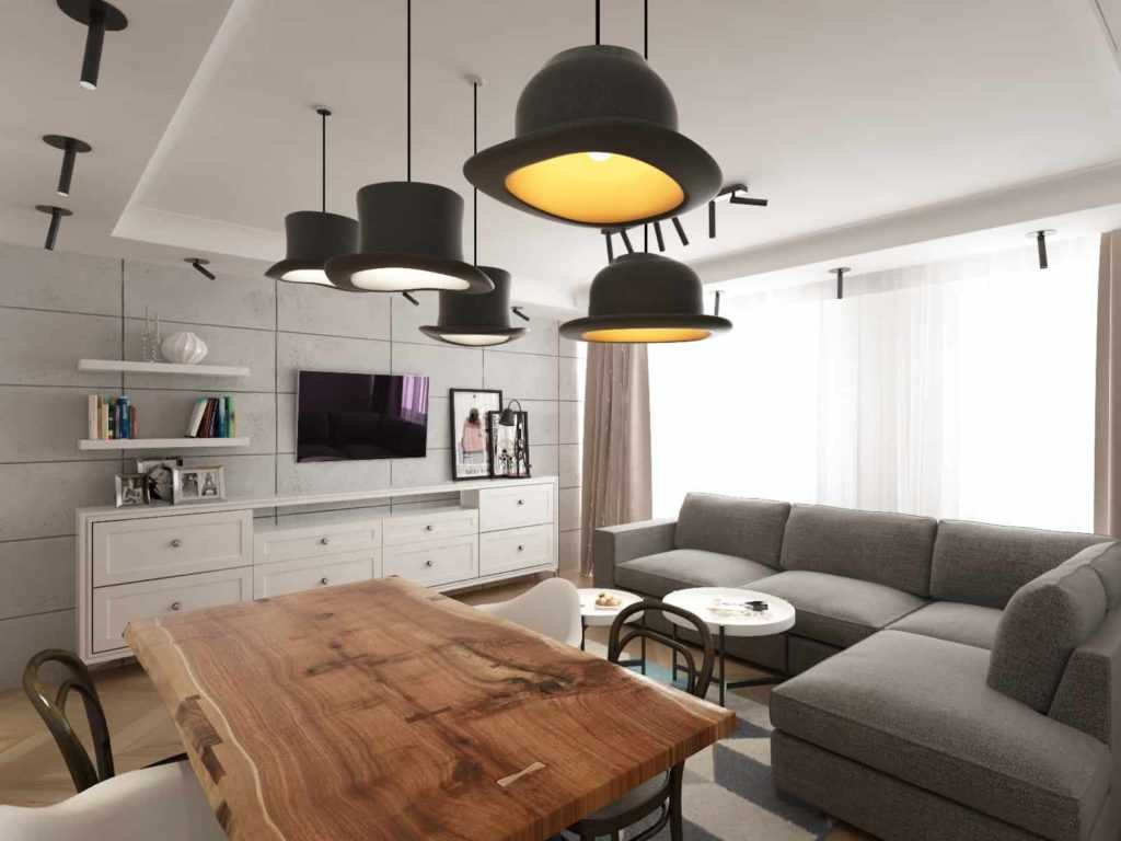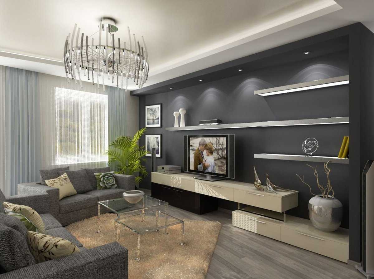 Освещение лучше сделать точечное, расположив софиты по всему периметру комнаты. Очень стильно и современно будет смотреться прием объединения комнаты с кухней, путем сноса перегородки. Вариант гостиной-студии очень моден и востребован в настоящее время.