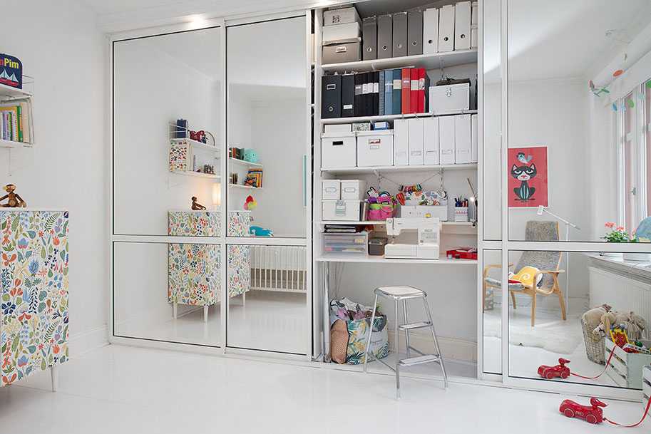 Необходимо помнить, что ребенок будет использовать предмет мебели, поэтому шкаф с зеркалом лучше не брать. Гардеробная дверь обязана быть прочной и легко отмываться. То же самое со встроенным отделом мебели.