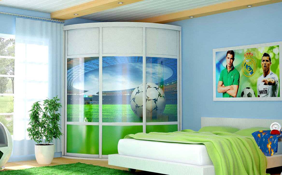 - Подростки предпочитают более сдержанный и строгий дизайн или же, наоборот, вызывающий, эксцентричный. Все зависит от темперамента владельца комнаты. Универсальным вариантом для мальчика будут нейтральные оттенки шкафа (серый, коричневый, синий, зеленый, голубой, хаки). Для девочки подойдут светлые спокойные тона (желтый, розовый, бежевый, мятный). Хороший вариант — белый шкаф с зеркальной панелью. Декор отличается лаконичностью, аккуратным небольшим рисунком, для украшения могут быть использованы изящный цветок, геометрический принт, абстрактное изображение.