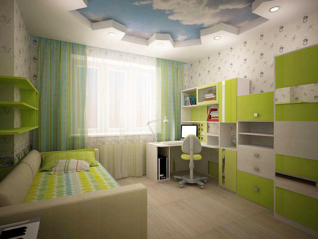 Если в комнате живут вместе мальчик и девочка, то лучше выбирать какие-либо нейтральные цвета (зеленый, светло-голубой и т.д.).
