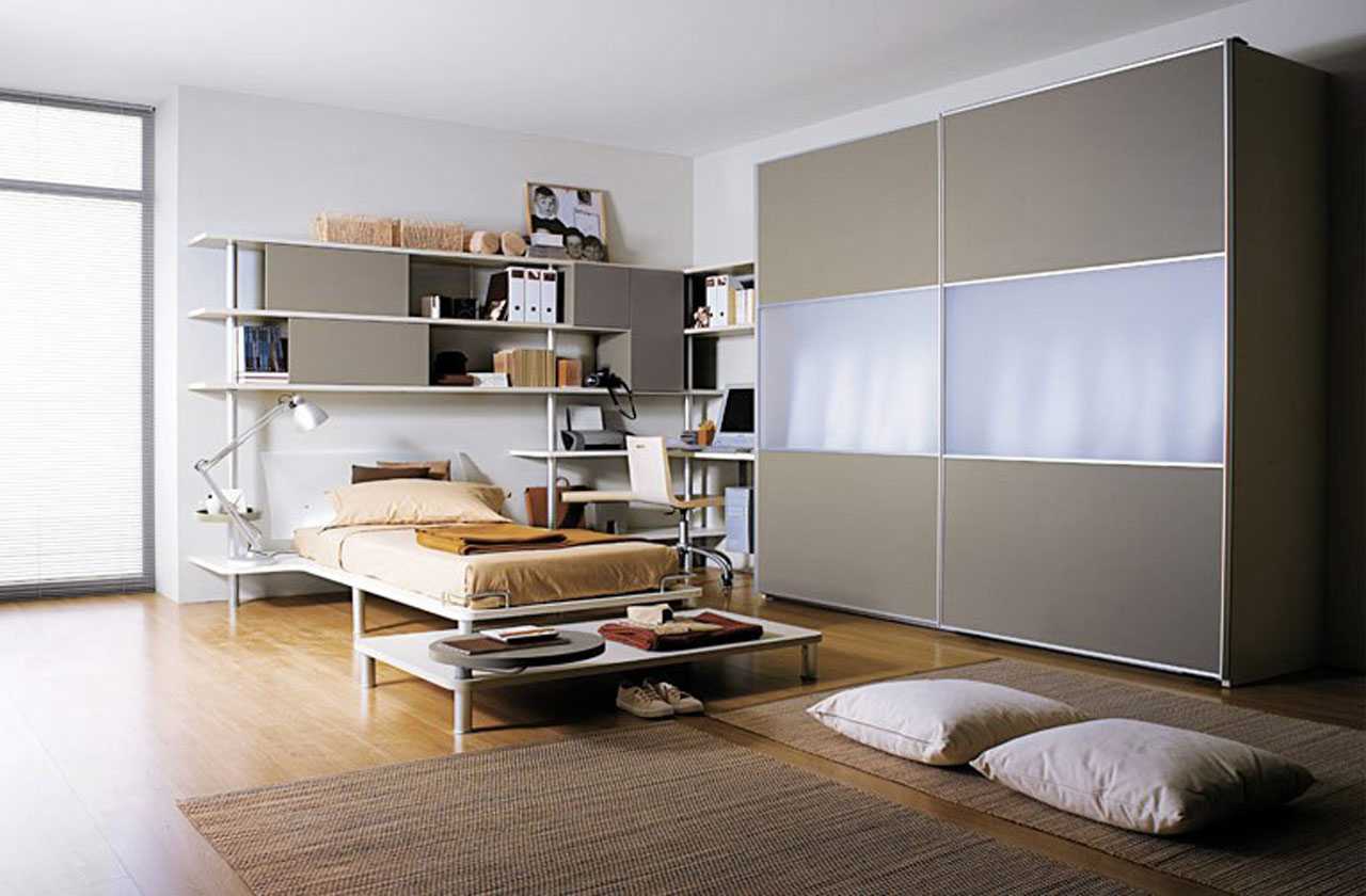 Цвет предметов мебели: шкаф, кровать, стол в одной палитре, но не общего оттенка. Благодаря этому, интерьер будет законченным.