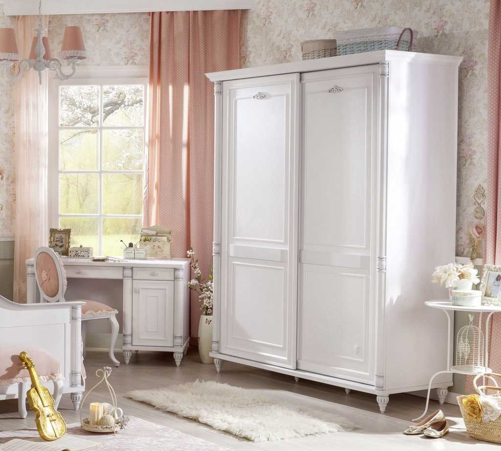 Родители, выбирая шкаф для детской, придерживаются первоначальной стилистической задумки. Девочкам 5 лет понравится комната принцессы с 2-дверной распашной конструкцией белого цвета.