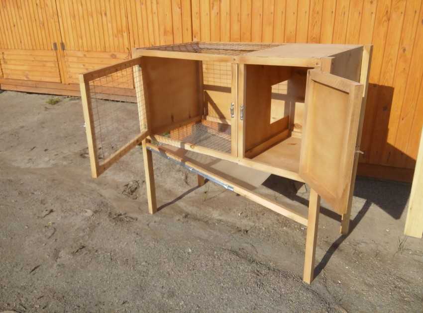 Чаще всего клетки делаются из дерева. Данный материал удобен и в работе с ним, и в эксплуатации, в деревянных клетках кролики меньше страдают от жары и холода. Тем не менее, есть и минусы – кролики любят грызть дерево, что объясняется нехваткой минеральных веществ в их рационе, а также постоянным ростом резцов, которые кролик пытается сточить. Чтобы решить эту проблему, следует прикрепить к выступающим деревянным частям жестяные полоски, а в клетку подкладывать веточки, чтобы животное точило зубы. Для стен и крыши подойдёт также толстая фанера или сетка. Для каркаса и опоры используются, как правило, деревянные бруски.