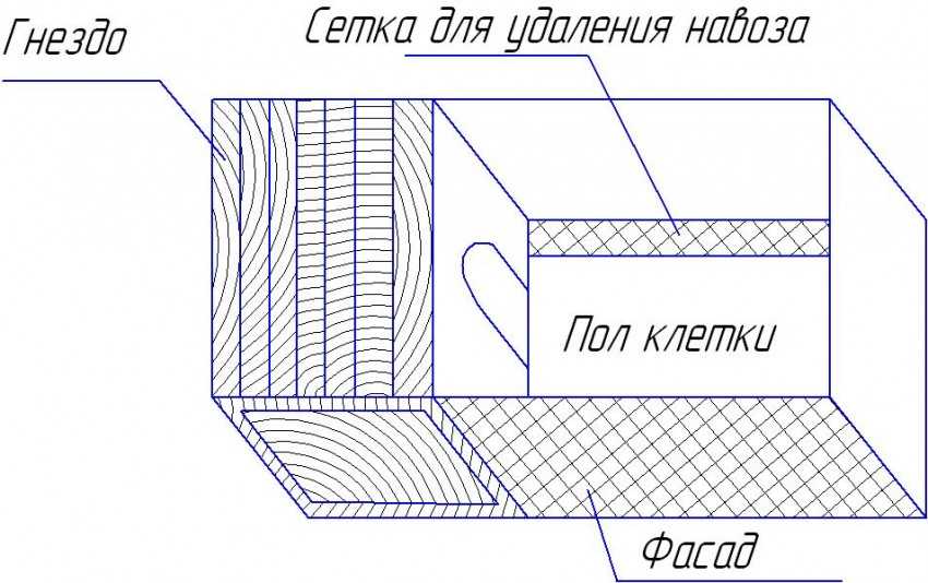 - Пол будущей клетки собирают из реек, между которыми оставляют промежутки в 0.5–1 см, или кладут металлическую сетку. Закрытые гнездовые отделения по бокам клетки можно сделать сплошными, положив фанеру.