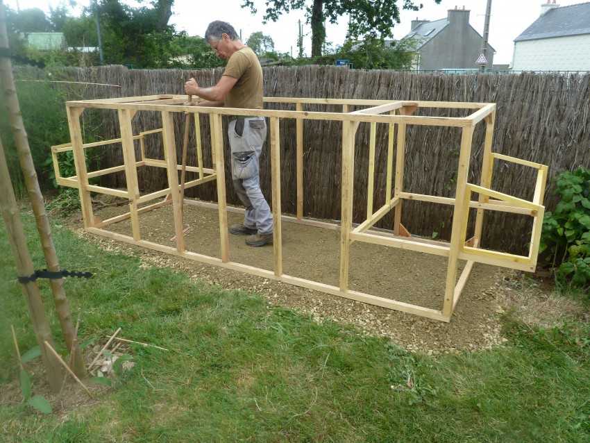 - Начинать строительство следует с изготовления каркаса. Собирают его из деревянного бруса, который распиливают согласно размерам и скрепляют на саморезы или гвозди. Если есть такая возможность, ножки каркаса рекомендуется углубить в землю для большей устойчивости конструкции.
