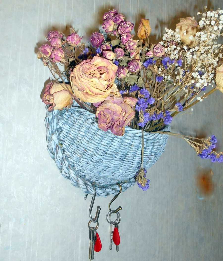 - Поставить в кашпо живые или искусственные цветы, засушенные травы, листья, или красивые перья. Ключница готова.