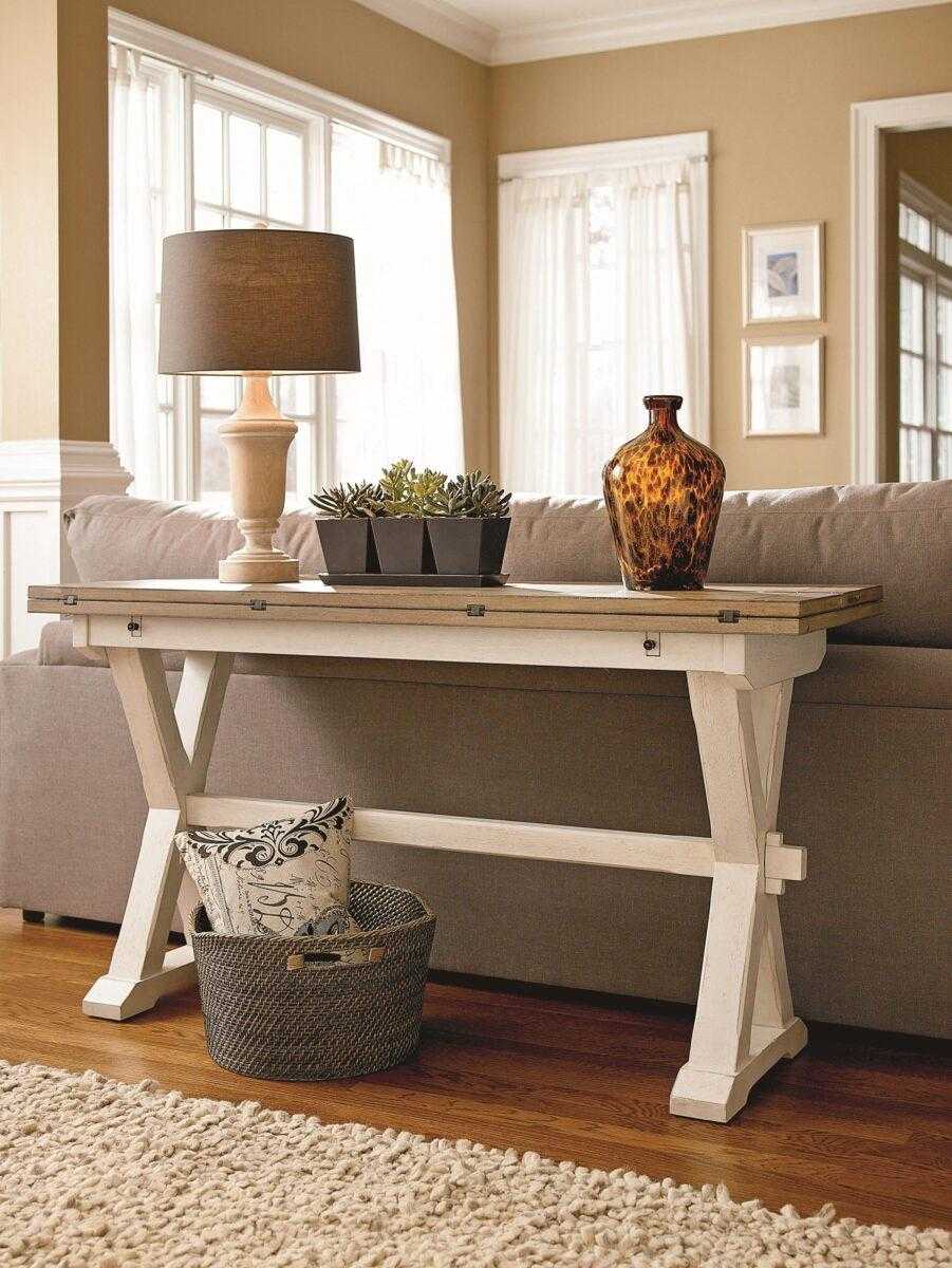 Но существуют также и консольные столики — трансформеры. Так маленький консольный столик из журнального может, раскладываясь, превращаться в достаточно большой обеденный стол.