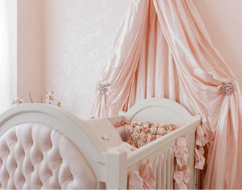 Балдахин над кроваткой девочки обычно изобилует кружевами, оборками, выполняется белоснежным, лавандовым, абрикосовым, нежно-розовым, амарантовым, лаймовым, светло-желтым либо цвета фуксии. Драпировка часто ассоциируется с кукольным домиком, дворцом принцессы, но допустимы более скромные варианты.