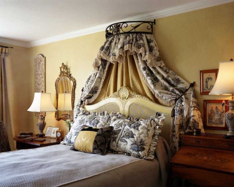 - Прованс, или «французский кантри», состоит из пастельных тонов, светлой мебели и текстур натуральных материалов. Деревенская составляющая здесь переплетается с роскошью, поэтому витиеватый полог с цветочными узорами выгодно подчеркнет этот стиль.