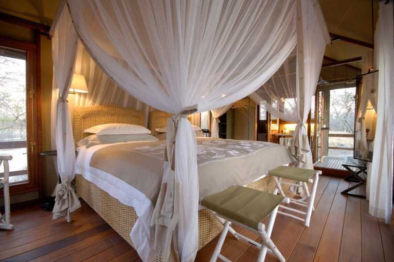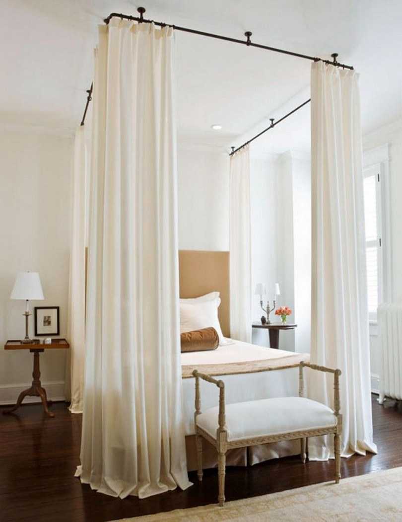 Если комната небольших размеров с низкими потолками, то затея с балдахином над кроватью в спальне превратится в нагромождение балок, ткани без эстетического эффекта и будет вызывать дискомфорт.