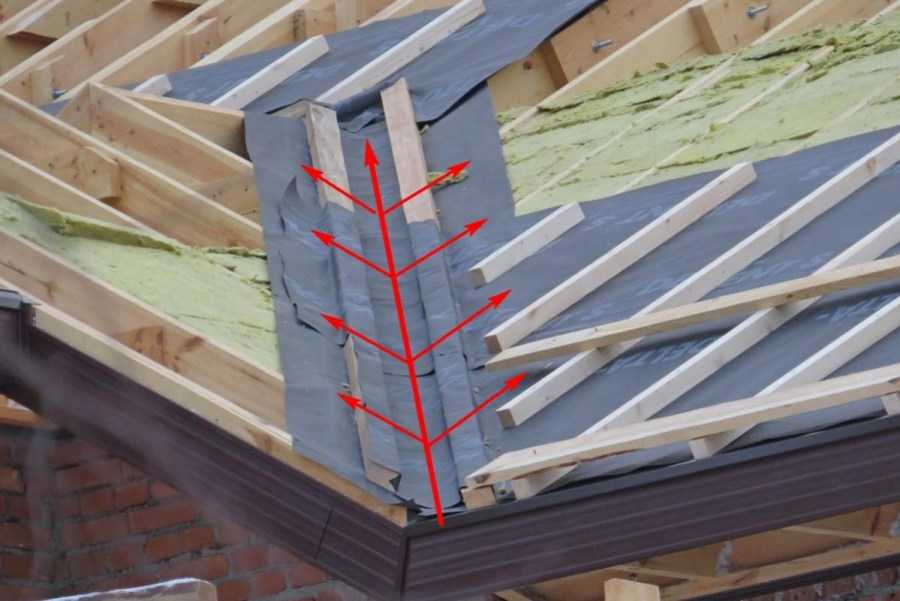 Для горизонтального стыка ендовы предполагается нахлест не менее 100 мм. При очень тупом угле ендову нужно защитить уложенным вдоль дополнительным слоем материаладля гидроизоляции.