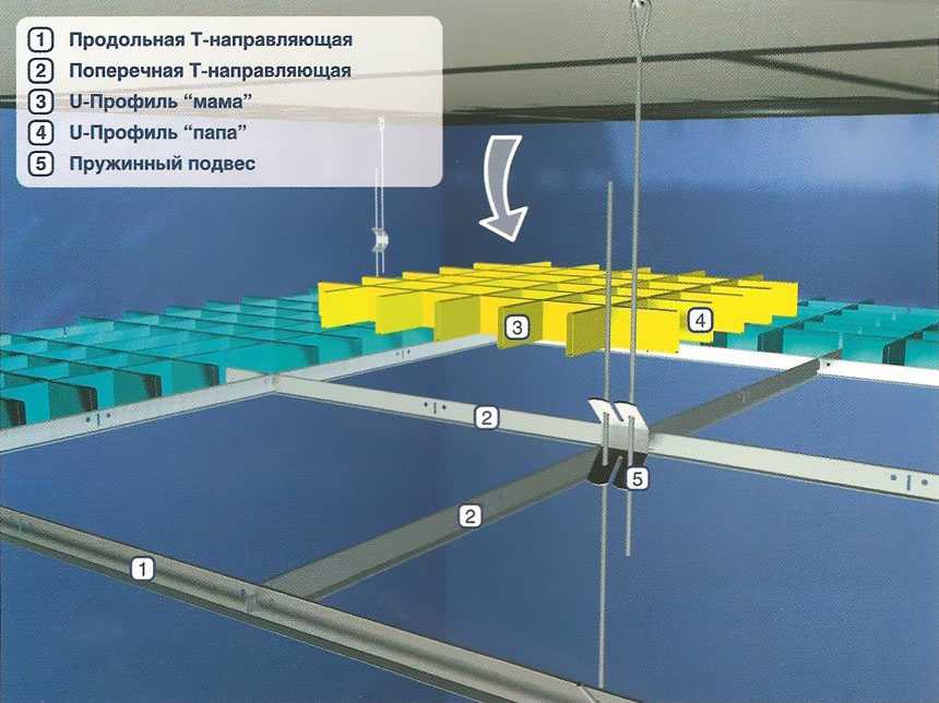 Конструкция такого необычного изделия состоит из системы подвесов. К ним крепятся особые профили, Т-образной формы. В результате получаются многочисленные ячейки. Обычно они имеют четкую геометрическую форму: