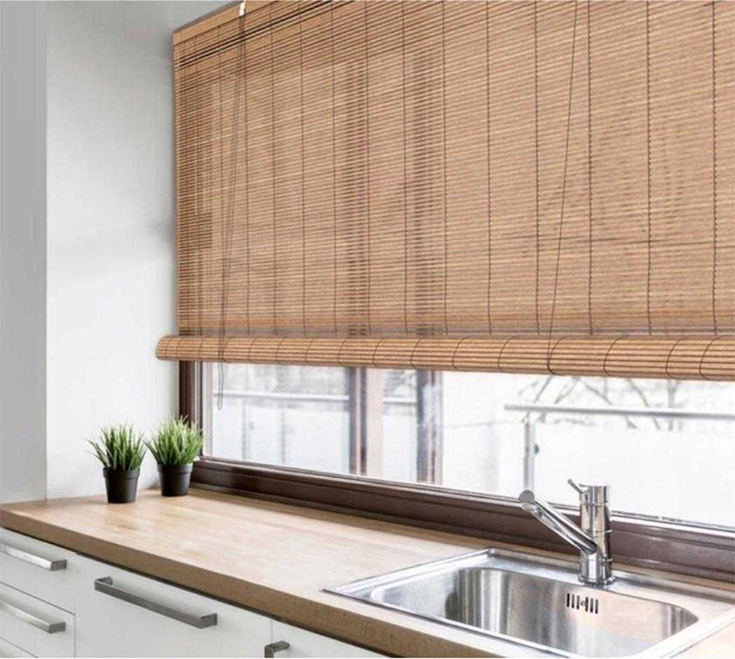 Для кухни в деревенском или японском стиле подойдут жалюзи, полотно которых изготовлено из тонких бамбуковых палочек. Такие шторы могут быть выполнены в виде рулона и римской шторы.